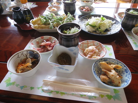 天ぷら、イチジクの煮た物&いろんな小鉢付き最後に、大盛新そばが付いて税込み¥1000−